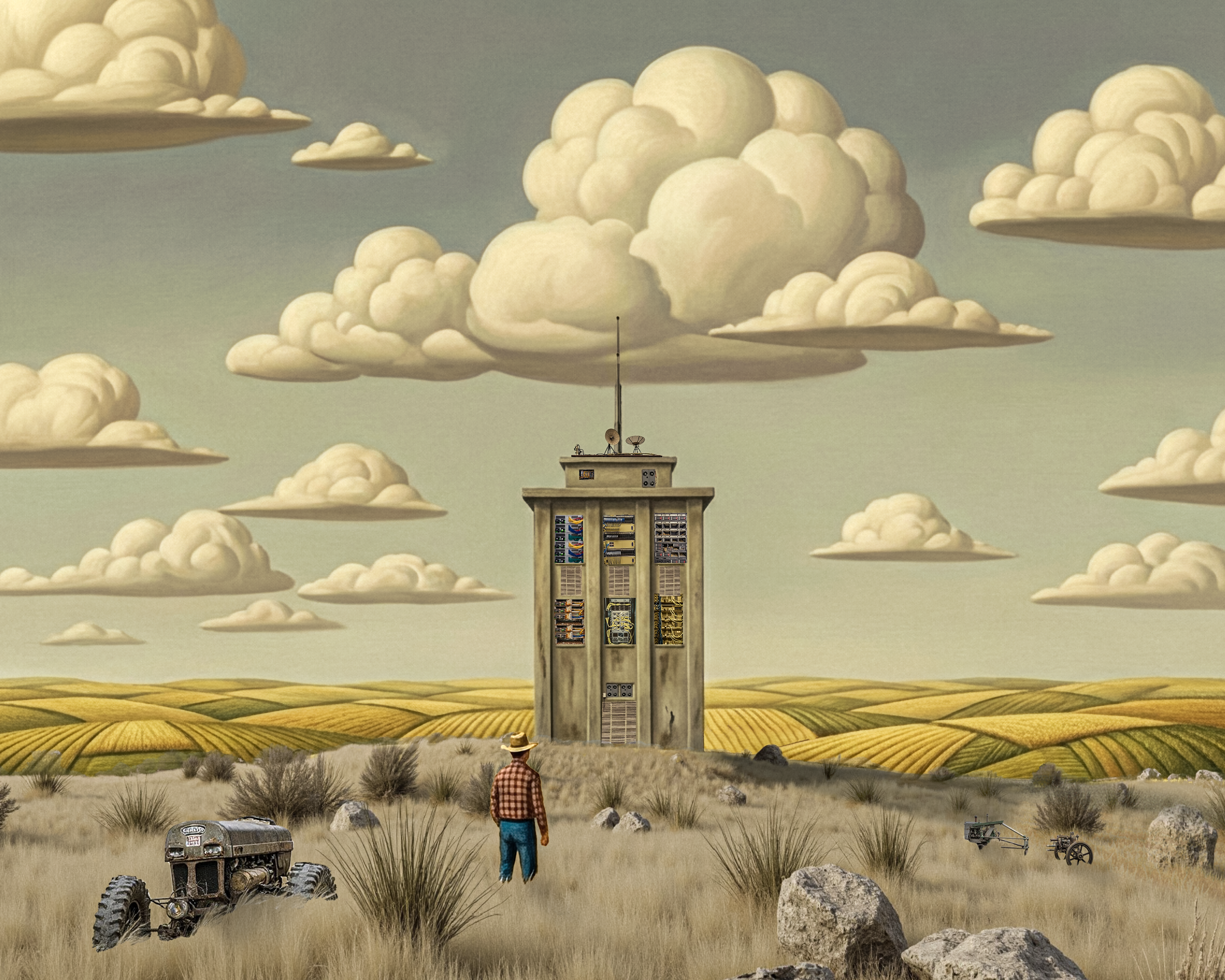 I asked ChatGPT what a landscape would look like after AI has vanished. How would it have changed and what would remain of the implements or machines that AI required? ChatGPT’s response: Your question invites us into a speculative archaeology—one that imagines not merely the absence of AI as a governing intelligence, but the slow reassertion of natural forces upon the infrastructures and apparatuses it left behind. If we place ourselves 25–50 years after such a disappearance, we are contemplating a landscape poised between the immediacy of abandonment and the more thorough erasures wrought by time, climate, and entropy. The landscape at first glance would not be so alien from our present. The contours of earth and sky remain—the hills, rivers, forests, plains—yet they have begun to reclaim what was once rigidly ordered by human–machine systems. Roads that AI-guided vehicles once traversed will still be visible, though already fractured, their surfaces broken by root systems prying through asphalt and moss painting irregular green hieroglyphs across their faces. Cities, no longer humming with algorithmic logistics, would stand in uneasy silence. Glass towers may remain upright, though their windows spidered by storms, while wind drives seeds into the seams of concrete. Ivy and rust will collaborate in their slow, patient labor, and within 50 years, entire façades may be softened beneath cascading vegetation. The landscape 25–50 years after AI’s disappearance would be neither wholly human nor wholly natural. It would be a liminal world—part ruin, part regrowth—where the implements of AI persist as hollow forms, stripped of their animating intelligence, becoming both monuments to obsolescence and raw matter for ecological succession.